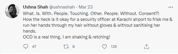 Triggered and angry, she wrote, “What is with people. Touching other people without consent?!” Narrating the unfortunate incident, she further added, “How the heck is it okay for a security officer at Karachi airport to frisk me and run her hands through my hair without gloves and without sanitizing her hands? OCD is a real thing, I am shaking &retching!”Many agreed with the Balaa star and expressed how they’ve often felt the same when at airport security checks.