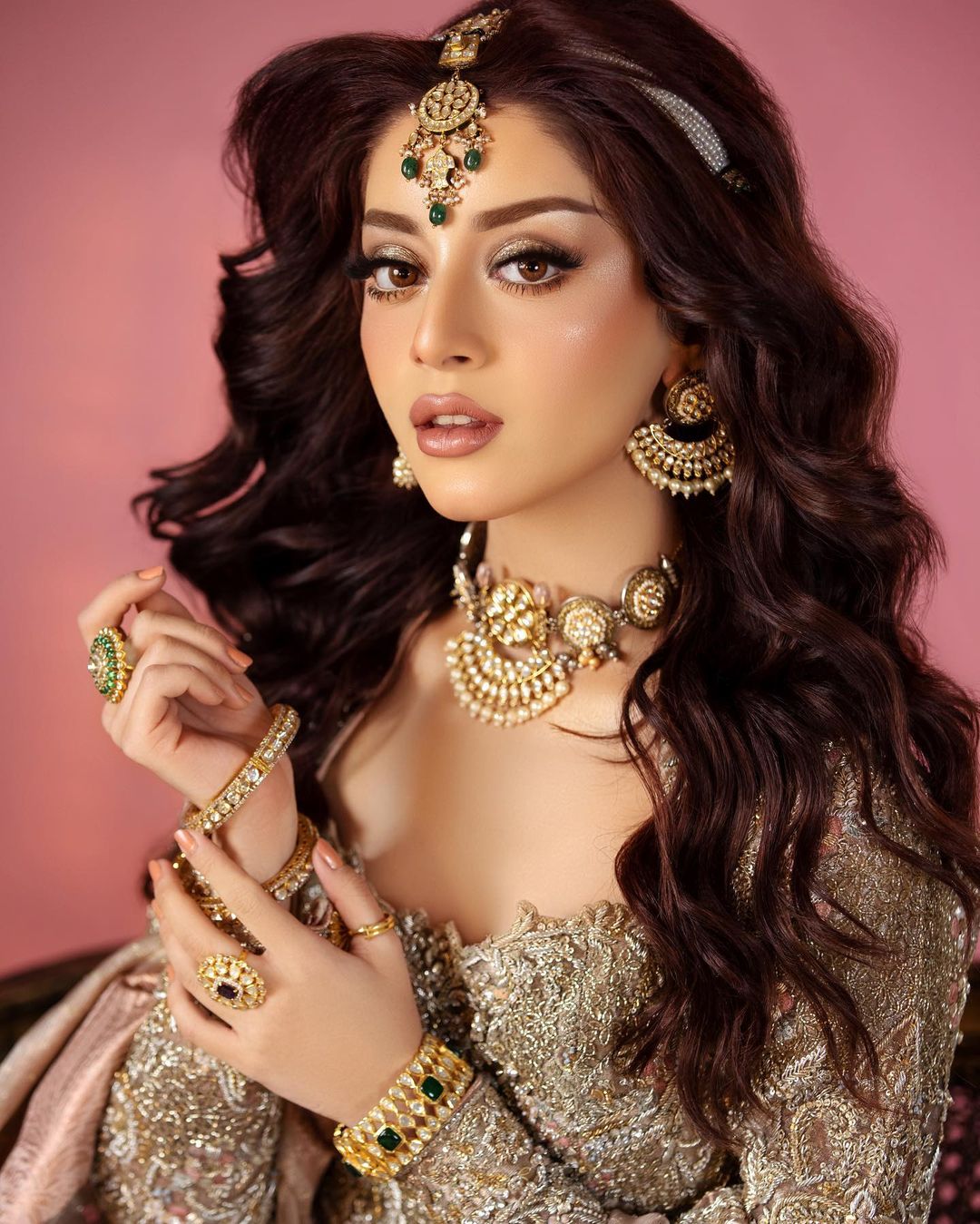 Islamabad: Alizeh Shah and Maryam Azhar recently collaborated on a bridal makeup campaign, and both performed flawlessly. For the viral photo shoot with Shah, Maryam used golden and bronze makeup. Her hair is flawlessly styled with bouncy curls that fall to her shoulders. Farah and Fatima’s romantic gold wedding gown was worn by the amazing actress. The jewels, outfit, cosmetics, and overall beauty are all in perfect balance with one another.