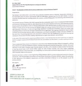 In a letter addressed to federal ministers for planning and development, education and professional development, and chairman Pakistan Council of Architecture and Town Planning; Dr Abdul Rehman urged a revision in the intake limit for annual admissions in the architecture programs.