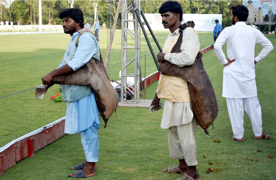 The animal hide is dried and then sewn to make a vessel that holds water. The presence of these two individuals also shows the extremes in Pakistani society, where a nation with nuclear capability also has people who have nothing but these water casks to store water.