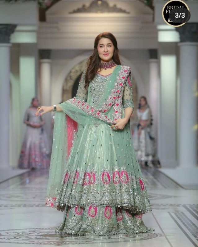 Kashee’s solo show had a fantastic line-up of celebrities sashaying down the catwalk showcasing his huge collection that covered the entire wedding events. Film star Sana Fakhar opened the show for Kashee’s while TikTok star Rebecca, Madiha, Saba Faisal, and Sarwat Gillani closed the Mayoon segment of the show.