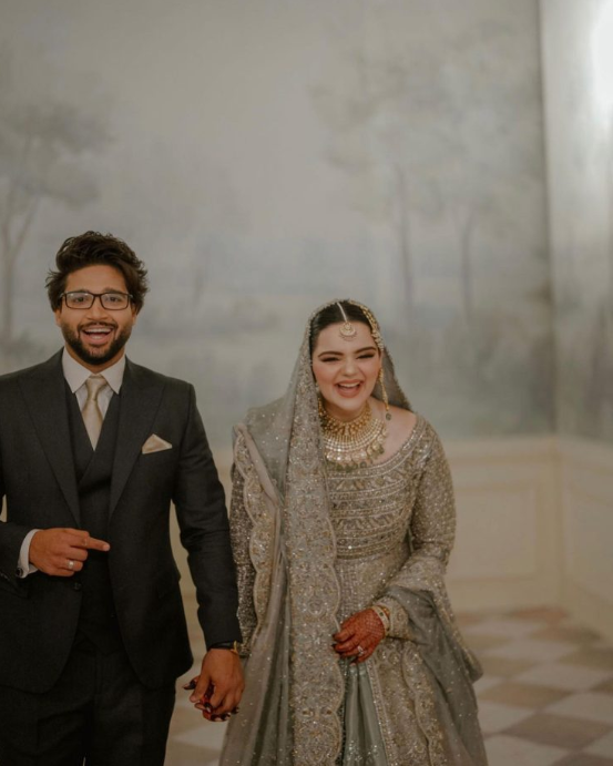 On her walima, Anmol exuded elegance in a shimmering silver bridal gown complemented by exquisite traditional jewelry, while Imam complemented her perfectly in a sharp black suit.