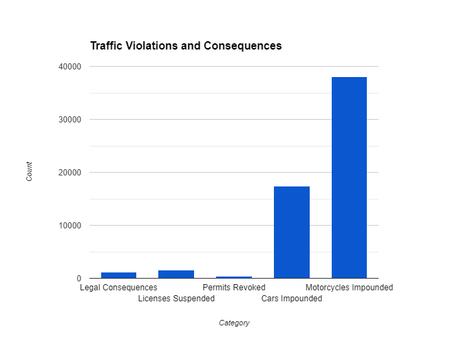 Notably, 1,151 individuals faced legal consequences for severe traffic violations. In a stringent move, 1,587 driving licenses were suspended, and permits for 419 public transport vehicles were revoked. Further, as a consequence of severe violations, 17,420 cars and 38,000 motorcycles were impounded across various police stations.