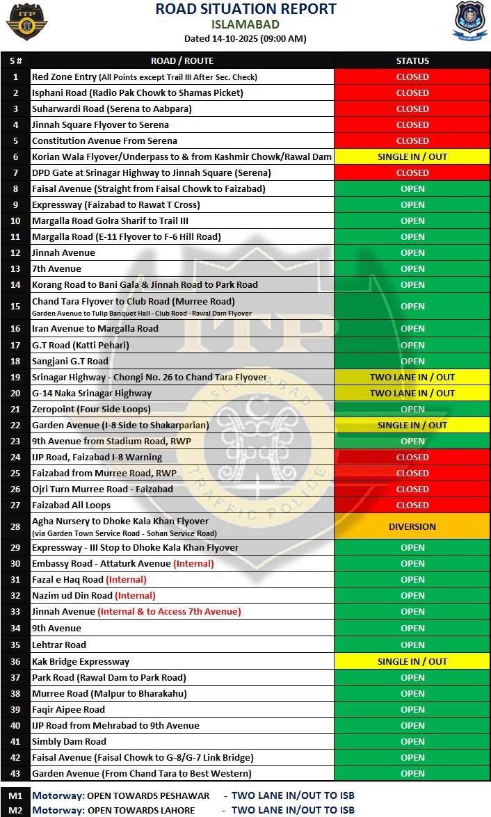 An ITP official told APP that the entry of all heavy vehicles into Islamabad remains suspended until further notice. Several routes within and around the Red Zone have been closed, while others are partially open under controlled traffic flow to ensure smooth movement.