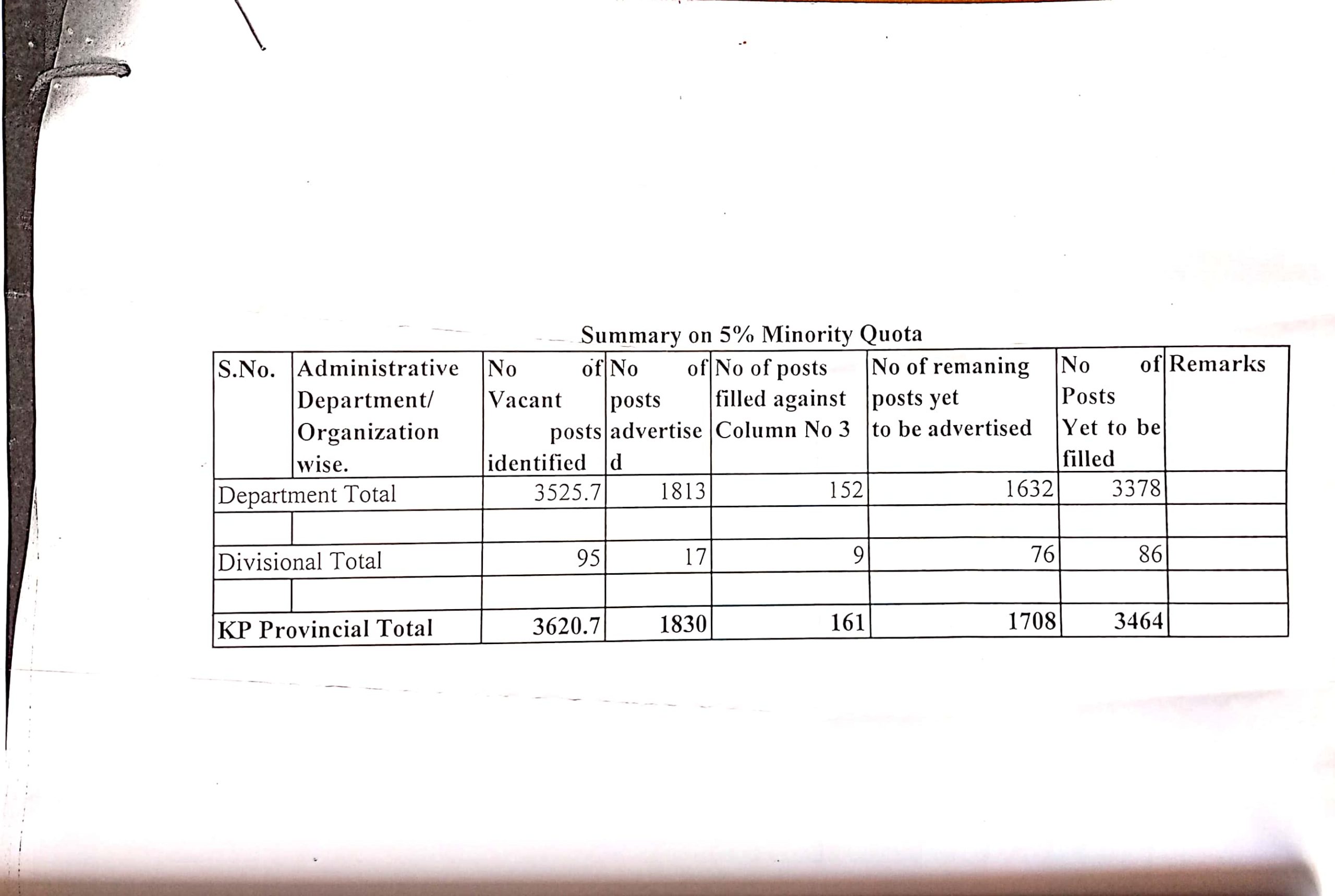 Information received by Boot Imtiaz Masih, a resident of Hyderabad, under the KP Right to Information Act 2013, indicates that as many as 3525.7 vacant posts are waiting to be filled in different administrative departments in line with the 5 percent minority job quota across the province.