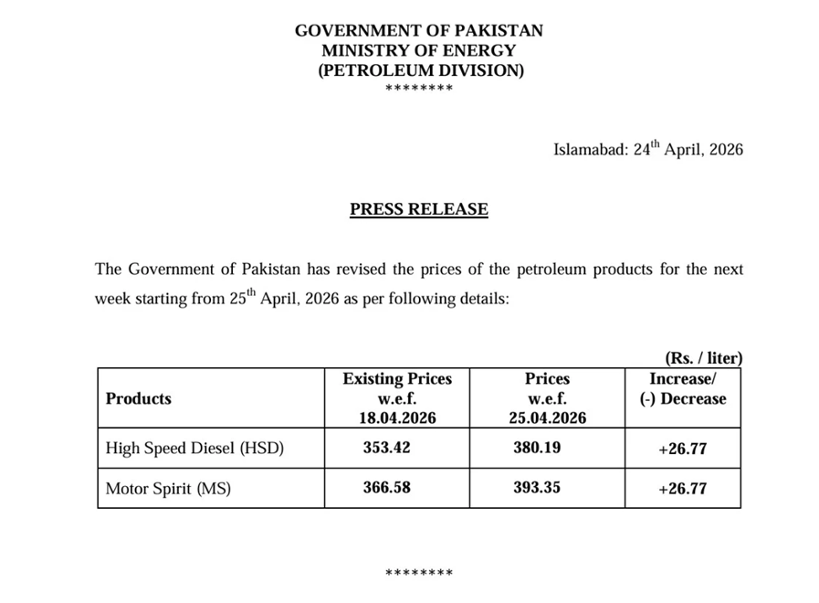 The revised rates came into effect from April 25, 2026, and will remain applicable for one week. Following the hike, the price of petrol has surged to Rs393.35 per litre, while HSD has climbed from Rs353.42 to Rs380.19 per litre.