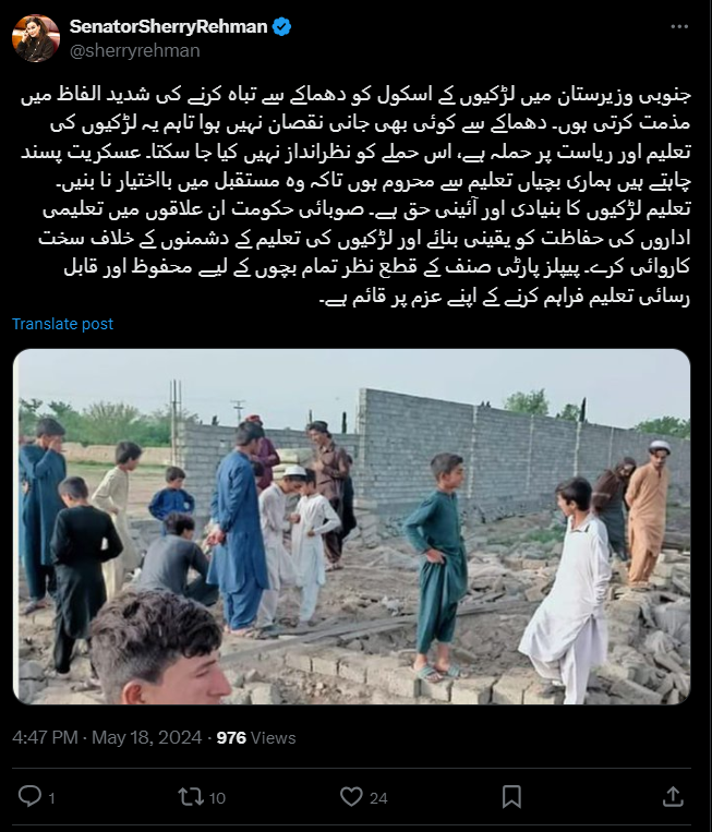 Islamabad: PPP Senior Leader Sherry Rehman has strongly condemned the attack on the girls’ school in South Waziristan.